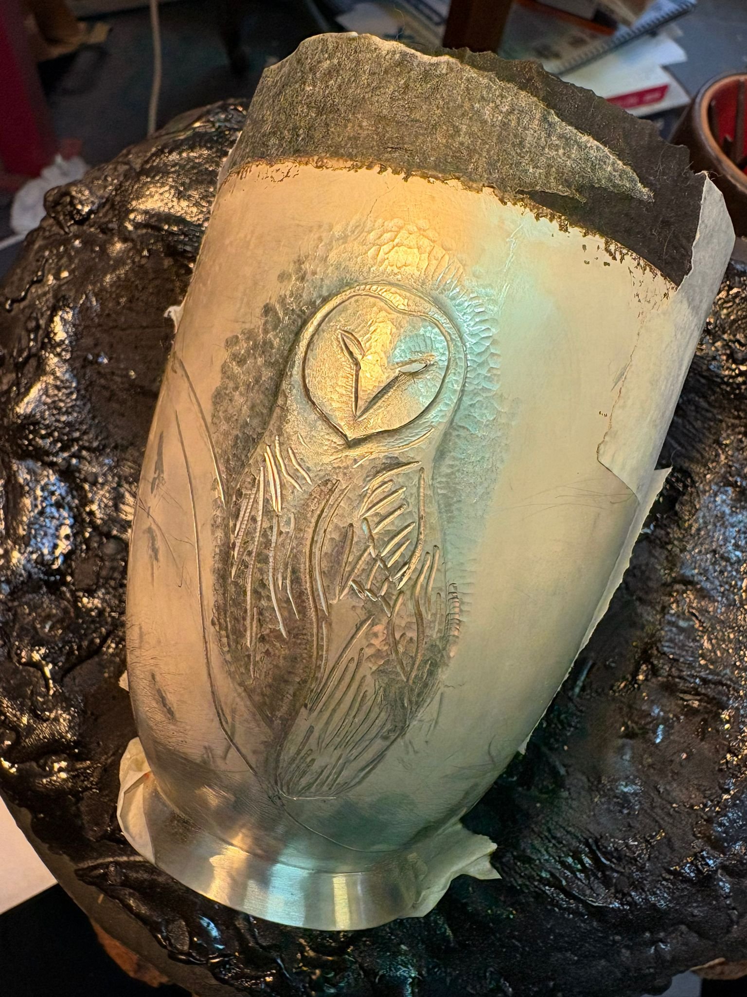Silversmith Zoe Watts (studio 17) is working on this stunning commission for New College Oxford. The college has a notable collection of silverware and endeavours to commission leading British silversmiths to add to this. The beautiful Owl motif on this water beaker is created using the technique of hand chasing and repousse and uses the very same tools used for mark making that Zoe uses to teach in our silversmithing workshops.