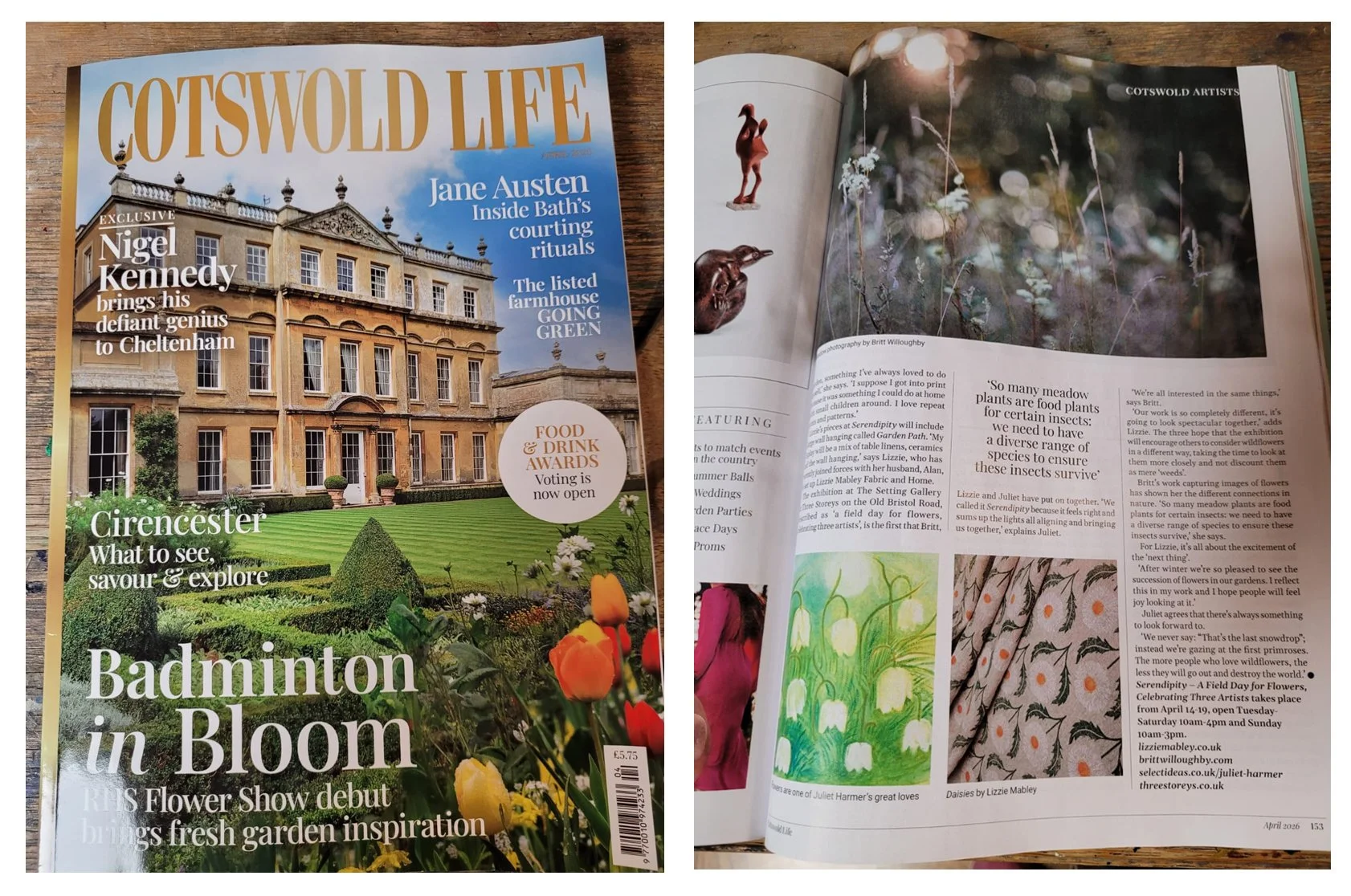 Lizzie Mabley (Studio 4) joins photographer Britt Willoughby and painter Juliet Harmer for ‘Serendipity’, a new exhibition at 3 Storeys in Nailsworth. This is a great chance to see Lizzie’s hand printed and stitched quilt from last years Crafts Alive/Victoria Works Studios collaboration, plus lots of lovely new work. If you can get your hands on a copy of this month’s Country Life magazine you’ll also find a lovely feature on the artists inside. The exhibition runs from April 14th to 19th at The Setting Gallery, Three Storeys, Nailsworth.